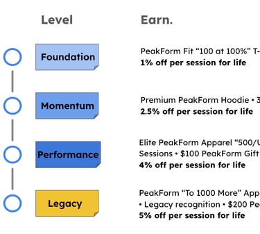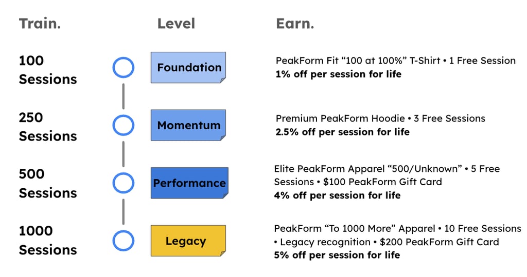 At PeakForm Fitness, consistency is everything. Our Rewards Program is designed to thank you for showing up, putting in the work, and committing to your long-term health. Every session you train counts toward lifetime rewards that never reset.